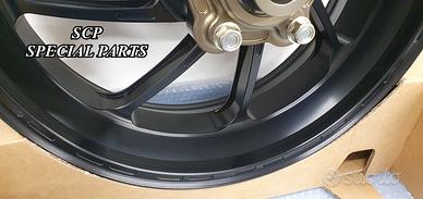 Cerchi PVM a 8 razze, realizzati in alluminio forgiato sportversion lightweight. Questo nuovo modello consente di avere la resistenza e robustezza dell'alluminio abbinato ad un peso comparabile al magnesio. Infatti i cerchi sono leggerissimi: soli 7,3 kg la coppia! Un peso eccezionale, come i migliori cerchi in magnesio ma con la resistenza dell'alluminio forgiato e una durata nel tempo nettamente superiore. Per ottimizzare il peso del cerchio son si è usato un normale processo di verniciatura, bensì i cerchi sono ANODIZZATI attraverso un processo chimico. La notevole centralizzazione delle masse ottenuta nella realizzazione di questa tipologia di cerchi, abbinata all'estrema leggerezza, fa si che vi sia una diminuzione drammatica dell'effetto giroscopico. Ciò si traduce in cambi di direzione fulminei abbinati alla possibilità di ritardare molto di più la staccata e alla capacità nettamente superiore della moto di tenere la corda e poter disegnare traiettorie molto più strette a netto vantaggio dell'uscita di curva. I cerchi sono disponibili su richiesta anche anodizzati di altri coloi. Mozzo portacorona e Corona speciale sono in omaggio. Flange di supporto dischi e mozzo sono ricavati dal pieno e sottoposti ad un particolare processo di indurimento superficiale.