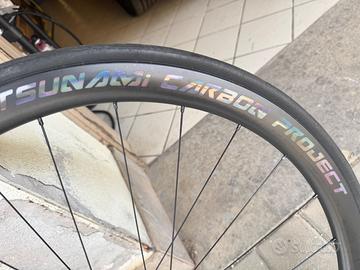 Vendo come da titolo , coppia di cerchi in carbonio Tsunami Carbon Project. Condizioni pari al nuovo (avranno percorso 1500km), peso 1350 grammi (coppia). Mozzi dt swiss 240. Vendo per inutilizzo. Tubless, vendo assieme a copertoni continental 5000, anch’essi in ottime condizioni. Sull’anteriore il mozzo non è montato ma è presente e sarà montato prima della consegna. È smontato perché sulla vecchia bici avevo un perno da 14mm