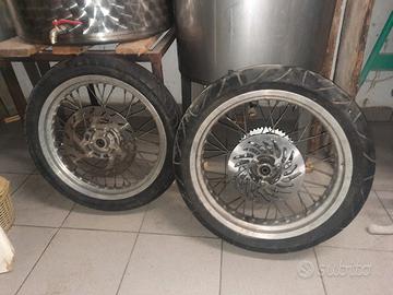 Vendo cerchi di derivazione derbi gommati come da titolo, presentano corona da 50 denti e disco posteriore (da 280mm) nuovi, le gomme sono un po' usurate ma ancora utilizzabili.