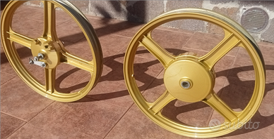 Sono stati preparati e verniciati da carrozziere trattati con fondo epossidico e verniciati colore oro con vernice doppio strato PPG.guardate il mozzo anteriore la levetta dove alloggia il filo del freno quella non è stata verniciata si vede che è nuova non sostituita perché i cerchi sono praticamente nuovi con i loro anni ,ma quasi inutilizzati lucidissimi e drittissimi
