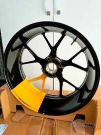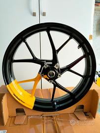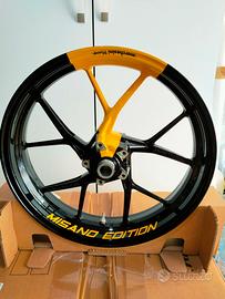vendo cerchi originali ducati panigale v4. sono stati personalizzati con verniciatura nero lucido e razza gialla. lavoro eseguito da carrozzeria. privi di difetti. completi di boccole e valvole. preferibile consegna a mano, ma posso anche spedire a carico dell'acquirente. NB. lo so che i cerchi sono Enkei e non Marchesini. l adesivo è stato applicato successivamente e facilmente removibile.