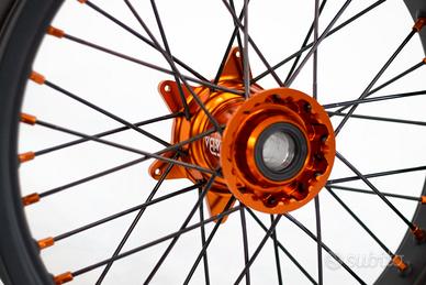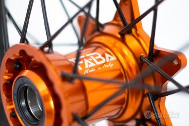 cerchi faba supermoto ktm con mozzo in ergal arancione raggi neri e nipples arancio , montano sui seguenti modelli motard :