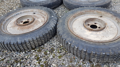 b) 4 cerchi gommati, 2 con bordo tondo e 2 con bordo normale; in 2 di questi 4 cerchi sono montate 2 gomme tacchettate da neve in ottimo stato; le altre 2 gomme non sono buone; tutto €250.