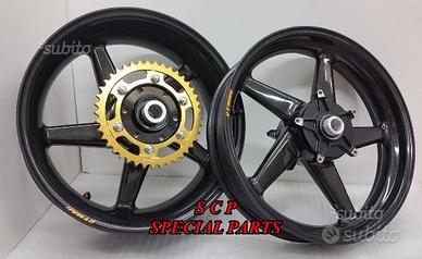 Pensate che la coppia di cerchi in carbonio per R1 2015 2021 pronta per il montaggio con boccole, flange, mozzo porta corona e corona pesa solo 7.5 kg !!!!!