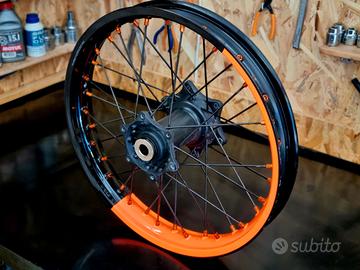 Ruote Alpina come nuove per KTM tutte le annate e tutti i modelli dal 2006 al 2026. Le misure sono i classici 19 - 21 da motocross. Usate solo una volta per esibizione in parco chiuso mai vista la terra. Perfette condizioni generali. Pronte all uso. Nell ultima foto si puo vedere come sono da montate.
