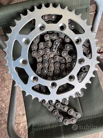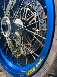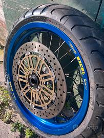 Kit motard completo. Coppia di cerchi motard provenienza tm400 Takasago Excel. Completi di gomme, disco anteriore 320mm, freno completo Brembo con distanziale. Corona 40 con catena. Al posteriorre cuscinetti/ paraoli nuovi mai usati . Nessun difetto. Prezzo non trattabile. Spese di spedizione a parte.