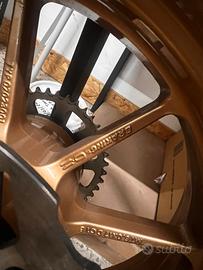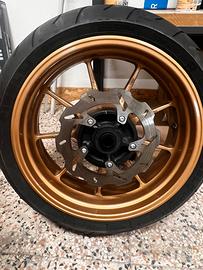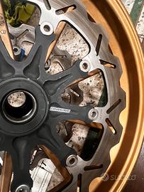 Cerchi oz usati solo un mese montati su aprilia rsv mille forniti completi con dischi anteriori farfallati E posteriore con corona montata e copertone buono per 50% Sono compagibili anche per aprilia tutti i modelli Suzuki e kawasaki