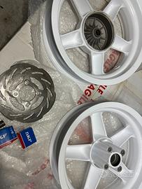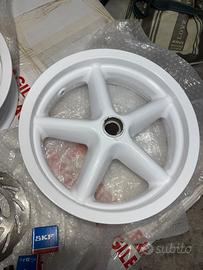 Vendo fantastici cerchioni da 12 pollici originali per mbk Booster Spirit o Yamaha bws ,appena sabbiati e verniciati a polvere , da professionisti , nessun difetto , vendo il kit completo di cuscinetti nuovi skf , e disco freno nuovo a margherita più adesivi originali 12 inc