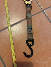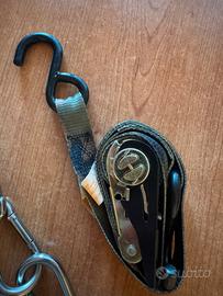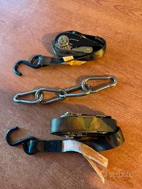 Vendo per inutilizzo coppia di cinghie a cricchetto, con gancio metallico plastificato ad entrambe le estremità , più quattro moschettoni in acciaio inox, come da foto.