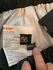 Completo giacca e pantaloni da moto Dainese, color verde taglia 58, la giacca, con più tasche, ha imbottitura removibile interna con spalle rinforzate tessuto Cordura. I pantaloni tessuto Cordura sono praticamente nuovi con imbottitura sui fianchi e bretelle con gancio.