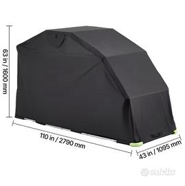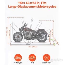 Dimensioni di 110 x 43 x 63 pollici, il nostro riparo per moto si adatta alla maggior parte delle moto, cruiser e bici elettriche. Offre una protezione a copertura totale con ampio spazio, non esercita pressione sul veicolo e consente un facile parcheggio e accesso