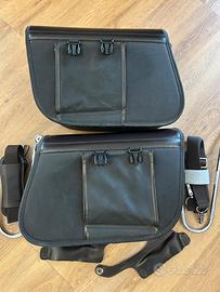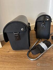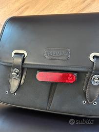 Coppia di borse laterali Triumph in cotone cerato e cuoio, usate poche volte e in ottime condizioni, sono inclusi i supporti in acciaio cromat, le 2 tracolle e gli agganci per fissarle al telaio moto. Codici OEM: A9518210; A9518207 Per altre foto chiedere senza esitazione. Compatibilili con Triumph - Bonneville - T100 - T120 dal 2016 ad oggi Triumph - Street Cup Triumph - Street Scrambler Triumph - Street Twin, thruxton. Resistente e idrorepellenti realizzata in vera pelle, cotone cerato nero di alta qualità e accessori in metallo brunito spazzolato.