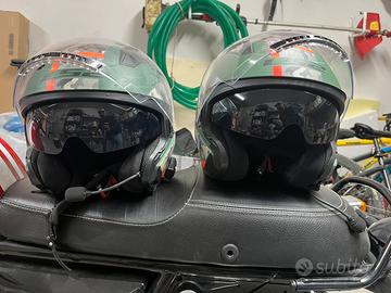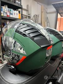 Coppia Caschi Jet LS2 verde/arancio con inserti camouflage. Taglia XL ed M, in ottime condizioni. La taglia XL è stato usato quotidianamente per un 6 mesi la scorsa stagioje e presenta solo la parte posteriore del rivestimento un pò rovinata (ultima foto), per il resto è in ottime condizioni. La taglia M invece usata molto meno si presenta meglio. Costo attuale sul web a 80€ cad.