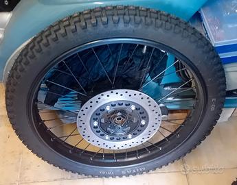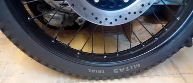 Vendo coppia di cerchi per Yamaha xt 600 2kf... verniciati di nero.... anteriore con disco freno a margherita nuovo e gommato Mitas Trial E-05 3.00-21 54S... posteriore con mozzo corona e disco freno nuovo e gommato Dunlop K180 130/80-18... le gomme sono nuove mai andate in strada e tenute sempre al buio...