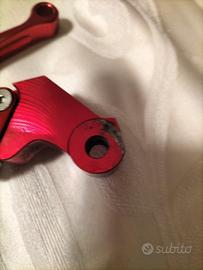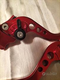 Vendo coppia di leve (freno anteriore e frizione) in alluminio ricavato dal pieno (CNC) con finitura anodizzata rossa. Le leve sono caratterizzate da un design sportivo e alleggerito grazie ai fori aerodinamici sulla parte finale.