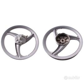 (R.24334) Vendo coppia di cerchi in lega grigi usati a tre razze elicoidali Evo 3 per Ciao marchiati E - 16 x 1.35 DOT - D , Piaggio e Grimeca , il prezzo si intende per la coppia
