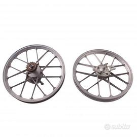 (R.22972) Vendo coppia di cerchi anteriore e posteriore in lega da 16 pollici usata sana per Motron R 102 marca Grimeca marchiate E - 1,35 x 16" DOT - D , foto del mezzo solo a scopo illustrativo