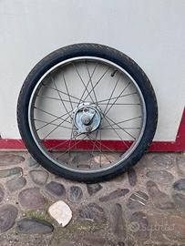 Vendo una coppia di ruote a raggi per piaggio ciao/bravo/si. Non presentano ammaccature e la cromatura è ancora in buone condizioni. Insieme cedo anche il mozzo a puleggia e il mozzo anteriore.