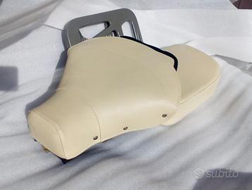 i sedili sono foderati in pelle bianca sul panna beige , la struttura della sella anteriore è in ferro con molle, il sellino posteriore ha invece la base in legno
