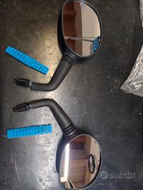 Vendo coppia di specchietti omologati nuovi ancora in busta, marca B&M, con relativi adattatori/colonnette per il montaggio sulla maggior parte degli attacchi a manubrio. Calotta in plastica, coprigambo in gomma. Adatti per scooter, moto, quad, quadricicli