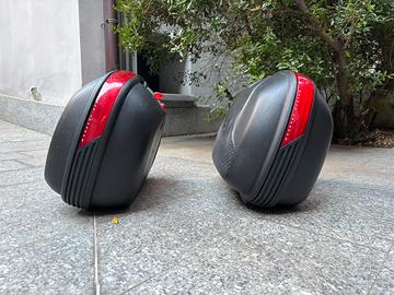 Coppia di bauletti in ottime condizioni e serratura unificata (basta una sola chiave per la coppia). Capienza 36 litri ciascuna e forma molto regolare ottima per il carico.