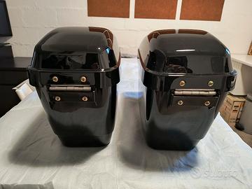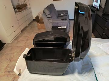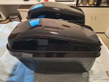 Vendo coppia valigie laterali moto universali, colore nero lucido, nuove con chiavi. Capacità 20 litri ciascuna, dimensioni: lunghezza 43cm, altezza 30cm, profondità 19cm. Supporti per fissaggio a telai non forniti.