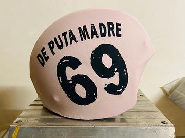 BELLISSIMI COPRICASCO CON LOGO -DE PUTA MADRE 69- IDEALI PER NASCONDERE SEGNI O GRAFFI DEL PROPRIO CASCO JET/CUSTOM OPPURE PER RENDERLO PARTICOLARE ED ORIGINALE SENZA DOVER RICORRERE AL CARROZZIERE O ALL’AEROGRAFO.