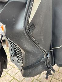 Coprigambe termoscudo Yamaha XMax 300 serie 2019, rovinato in alcuni punti come si vede dalle foto ma perfettamente funzionale e ben agganciato alla moto che non ne compromette il suo utilizzo. Caldo per l’inverno dotato di pelliccia nella parte interiore. Compreso di borsa da trasporto