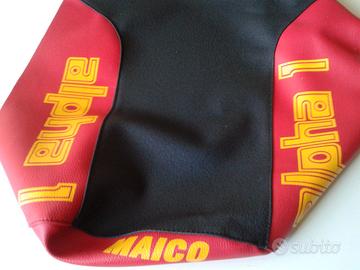 Copertina sella copri sella fodera sella per moto Maico modelli cross e regolarità/enduro dal 1970 al 1987 replicate dall'originale con vinili di qualità e serigrafie professionali, in versione come originale o bicolore antiscivolo.