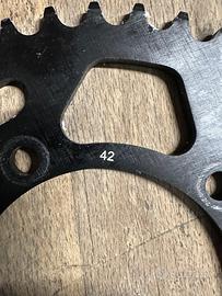 Vendo corona posteriore Supersprox 42 denti (passo 520), attacco a 5 fori, codice 703. Compatibile con Aprilia RS 660 e altri modelli con lo stesso portacorona. Usata poco, in ottime condizioni (nessun dente usurato, solo segni superficiali da montaggio).