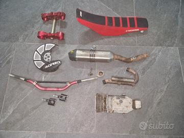 Vendo ricambi per crf 250x enduro cre uguali al 250 300 450 modello a carburatore anno 2002 2003 2004 2005 2006 3007 2008 2009: Telaio targato anno 2004 con cavalletto laterale Avantreno completo forcella showa 47 con piastre e asse ruota, cerchio con gomma e disco ed impianto frenante anteriore completo Coppia cerchi 18 21 enduro con dischi gomme e corona privi di crepe Cassa filtro modello enduro Mono ammortizzatore posteriore showa appena revisionato Telaietto com vano batteria Cavalletto laterale honda Piastre ergal rosse showa 47 rmz cr crf 250 450 cr 125 250 Paradiso acerbis anteriore Marmitta scarico terminale completo akrapovic Riser e manubrio renthal 997 da 28 con riser rmz crf yzf kxf yz cr wr wrf Paramotore slitta Sella Disponibile tantissimi ricambi