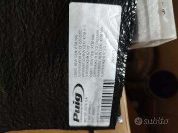Si propone in vendita cupolino sportivo della Puig, linea New Generation, specifico per KTM Super Duke 990 e 990R (modelli 2007-2013). Il prodotto è nuovo e sigillato nel suo imballo originale. Caratteristiche principali: Codice Prodotto: 4942F. Finitura: Fumé Scuro (Dark Smoke). Materiale: Metacrilato ad alto impatto, spessore 3mm. Design: Linea aerodinamica studiata appositamente per migliorare la protezione dal vento senza alterare l'estetica naked della moto. Il kit include tutto il necessario per l'installazione (staffe e viteria, se previste dal modello) e il manuale d'istruzioni originale. Non sono necessarie modifiche alla strumentazione o al faro originale.