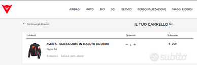 vendo giacca giubbotto giubbino dainese modello avro 5 tex usato 1 sola volta causa taglia errata. ha imbottitura invernale estraibile e cerniera di giunzione con il pantalone (non incluso). molto bella e attualissima, non un prodotto di 15 anni fa. è un prodotto ufficiale acquistato a settembre 2025 in negozio alla cifra di 269euro. spedizione disponibile