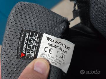 Stivali da moto Dainese, modello Energyca Air, taglia EU 40 (US 7.5 / UK 6.5 / 265mm). Questi stivali sono ideali per l'uso urbano e turistico nei mesi più caldi, grazie alla loro costruzione traforata che offre un'eccellente ventilazione. Condizioni eccellenti, usati pochissimo. La tomaia è in ottimo stato, pulita e priva di danni. La suola "Multi-grip" mostra un'usura minima, quasi inesistente. Anche l'interno è molto ben conservato. Caratteristiche principali: Costruzione in pelle traforata e tessuto mesh per la massima ventilazione. Chiusura con lacci e cinturino alla caviglia per una calzata sicura. Inserti riflettenti per maggiore visibilità. Suola in gomma "Multi-grip" ad alta aderenza. Certificazione CE (EN 13634:2017). Data di produzione: Dicembre 2021.