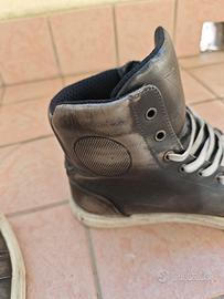 Scarpe da moto con protezioni su punta, malleolo e suola rinforzata. Hanno questo stile da "cafè racer" con I lacci e pelle invecchiati. La punta della scarpa sinistra é un po' invecchiata per via dell'uso del cambio. Whether you're a café racer, a true rocker or a fan of vintage, Street Rocker D-WP shoes are ideal for you. These shoes are a unique product made from soft, full grain top quality cowhide that is subjected to special treatment and hand finishing processes which make every pair unique. Street Rocker D-WP shoes are , CE – Category II - Directive 89/686/EEC certified and, apart from the excellent protection provided by rigid heel inserts and reinforced insoles, are ideally suited for all weather conditions thanks to an inner, waterproof, breathable D-WP membrane.