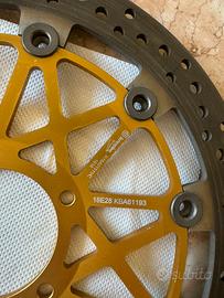 Brembo Racing Supersport da 330mm Per ducati Panigale v4 2018/2025 Panigale 1299/1199 I dischi BREMBO RACING SUPERSPORT spessore 5,5 mm. sono esattamente intercambiabili agli originali e adatti a lavorare sia con le pinze di serie oltre che con alcune BREMBO Racing. Vincitori di Campionati Mondiali SuperSport, sono dischi completamente flottanti composti dalla fascia frenante in acciaio martensitico termicamente trattato (in grado di resistere a qualsiasi sollecitazione termomeccanica) e dalla campana in lega d'alluminio ricavata dal pieno. L'accoppiamento tra i due componenti avviene per mezzo di 10 nottolini. Possibilita di trasporto vicenza verona padova Oppure spedizione.. I dischi sono stati usati per 850km