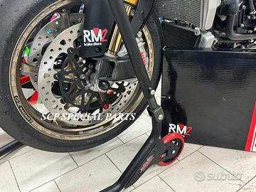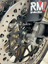 DISCHI RM2 UPGRADE SUPERBIKE DIAMENTRO 330mm SPESSORE 6mm FULL FLOTTANTI specifici per:*** APRILIA RSV4 RSV 4 1000 APRILIA TUONO V4 1000 APRILIA RSV4 RSV 4 1100 APRILIA TUONO V4 1100 APRILIA RSV 1000 1998 -2008 APRILIA TUONO 2002 - 2010 APRILIA SL FALCO 1000 APRILIA DORSODURO 1200 APRILIA 660 RS APRILIA TUONO 660 APRILIA DORSODURO 750 2008> APRILIA SHIVER 750 2007> APRILIA DORSODURO 900 APRILIA SHIVER 900 *** per i modelli indicati che di serie hanno dischi da 320mm e pinze radiali, vengono forniti anche distanziali per le pinze e relativi perni pinze. Per i modelli che di serie hanno pinze assiali serviranno arretratori pinze NON forniti. La coppia di dischi RM2 è full flottante con campana in ergal alleggerito, massima performance, con pista frenante da ben 6 mm di spessore e diametro 330 mm . Si possono mantenere le pinze freno radiali di serie e per i modelli dotati di pinze radiali e disco da 320mm vengono forniti distanziali pinze e perni specifici. Per i modelli con pinze assiali serviranno degli arretratori pinza NON forniti. I dischi full flottanti garantiscono un perfetto accoppiamento con la pastiglia freno per una frenata immediata senza ritardi ed efficace. Lo spessore da 6 mm annulla il fastidioso fenomeno di fading, ovvero quando all'aumentare delle temperature di esercizio dei dischi e il conseguente aumento della temperatura di tutto l impianto frenante la pompa freno diventa spugnosa e si "allunga" la corsa della stessa. La pista frenante racing da 330mm con speciale lavorazione del profilo a cuspide offre una perfetta resa della pastiglia freno e un notevole aumento della potenza frenante. QUESTO SET SPECIALE OFFRE LA POSSIBILITA' DI RITARDARE AL MASSIMO LA STACCATA CON INGRESSI IN CURVA FULMINEI. I DISCHI GARANTISCONO UNA POTENZA FRENANTE NOTEVOLMENTE AUMENTATA A PARITA' DI PRESSIONE SULLA LEVA MADE IN ITALY