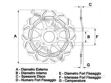 Le MISURE del disco sono: Diametro esterno: 245 mm Diametro interno: 83 mm Spessore pista: 5 mm Numero fori: 4 Diametro fori: 10 mm Interasse fori: 102 mm Il modello di disco DF775W monta sui seguenti modelli di DUCATI: 1098 2007-2008 1098 S 2007-2008 1198 2009-2011 1198 R 2008-2009 1198 S 2009-2010 1198 SP 2011 PANIGALE V4 1100 2018-2020 PANIGALE V4 1100 SPECIALE 2018-2020 PANIGALE V4 1100 SUPERLEGGERA 2020 PANIGALE V4 R 1000 2019-2020 PANIGALE V4 S 1100 2018-2020 STREETFIGHTER 1098 2009-2011 STREETFIGHTER 1098 S 2009-2013 STREETFIGHTER 1100 V4 2020 STREETFIGHTER 1100 V4 S 2020 SUPERSPORT 939 2017-2020 SUPERSPORT 939 S 2017-2020 SUPERSPORT 950 2021-2024 SUPERSPORT 950 S 2021-2024 l marchio spagnolo GALFER produttore di impianti frenanti di alta qualità offre la possibilità di scegliere la migliore soluzione per i tuoi freni per ogni tipologia di terreno. I dischi GALFER WAVE o MARGHERITA sono prodotti mediante taglio laser da acciaio inossidabile ad alto contenuto di carbonio e ricevono mirati trattamenti di qualità che gli conferiscono prestazioni ed un design senza pari. I materiali impiegati e le particolari lavorazioni usate garantiscono prestazioni senza compromessi oltre ad un notevole incremento della potenza frenante, una migliore dissipazione del calore, un'assoluta costanza nel rendimento e grazie al profilo Wave, una significativa riduzione di peso rispetto al prodotto originale. Il "Disc Wave" è stato ideato, sviluppato e brevettato da GALFER negli anni 90 ed ancora oggi è considerato un prodotto altamente innovativo e performante grazie alle sue caratteristiche Hi-tech e all'evoluzione del suo design in termini estetici e di rendimento. I "Disc Wave" GALFER detengono l'approvazione tedesca TUV KBA (nº 61147 – 61148).