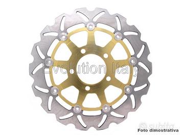 I nostri dischi MARGHERITA BAFFATI SEMIFLOTTANTI sono composti da tre materiali: - la pista è in acciaio MARTENSITICO AISI 420 TEMPRATA A CUORE - il cestello è in alluminio anodizzato ANTICORODAL 6082 ricavato dal pieno - i nottolini sono in ACCIAIO INOX. La loro peculiarità è di avere la pista libera di muoversi lateralmente rispetto al cestello. Grazie a questa proprietà, in caso di disallineamento della pista frenante, causata dal surriscaldamento, avverrà un autoallineamento tra pastiglie e pista che conferirà una soglia di resistenza agli sforzi maggiore rispetto ad un disco tradizionale. Il modello MARGHERITA BAFFATO è stato creato per facilitare: - una maggiore espulsione dei residui di consumo delle pastiglie - un maggior raffreddamento del disco La pista ed il cestello sono unite tramite NOTTOLINI in ACCIAIO possono montare sia RASAMENTI PIATTI che ONDULATI. Con i rasamenti piatti il disco risulta più rumoroso perchè il cestello è più libero di muoversi. Questo tipo di rasamento è generalmente usato solo in pista. Con i rasamenti ondulati il disco, ha sempre il movimento laterale della pista frenante, ma risulta più silenzioso perchè il gioco del cestello è ammortizzato proprio dal rasamento ondulato. Anche rispetto ai dischi solidi senza cestello hanno un ulteriore vantaggio perchè, data la ridotta trasmissione di calore dalla pista frenante al cestello, diminuisce il rischio di distorsione del disco. In anteprima si possono trovare tutti i nostri prodotti sul nostro sito www.evolutionitaly.com E' possibile avere ulteriori informazioni chiamando il numero 3286304361 da lunedì a sabato dalle 15:00 alle 19:00. I dischi sono compatibili con I seguenti modelli di TRIUMPH: DAYTONA 675 DAYTONA 675 R SPEED FOUR 600 STREET TRIPLE 675 STREET TRIPLE 675 R