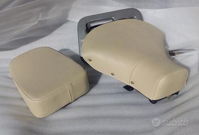 i sedili sono foderati in pelle bianca sul panna , beige , la struttura della sella anteriore è in ferro con molle, il sellino posteriore ha invece la base in legno