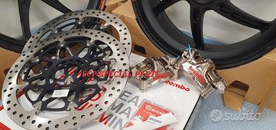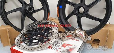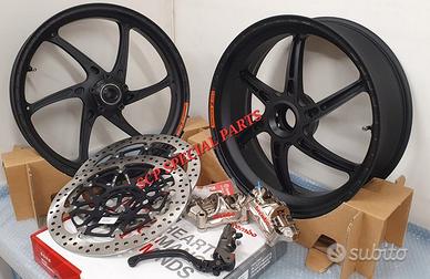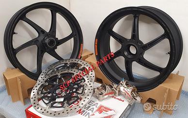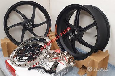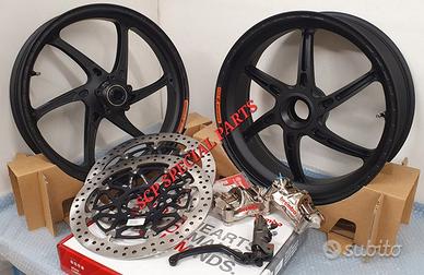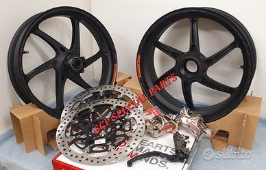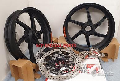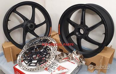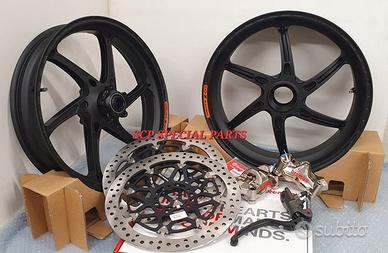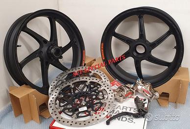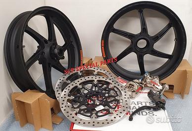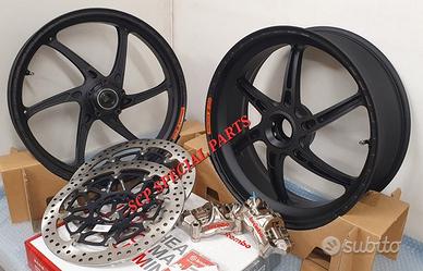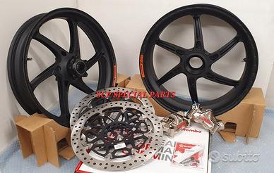 KIT SUPERBIKE CERCHI FORGIATI OZ GASS RSA RS-A CON DISCHI FRENO BREMBO T-DRIVE E PINZE FRENO BREMBO GP4RX NICHELATE , specifici per: DUCATI PANIGALE V4 V4S V4R DUCATI STREETFIGHTER V4 V4S V4SP DUCATI PANIGALE V2 955 ( upgrade a 6 pollici posteriore) DUCATI STREETFIGHTER V2 955 ( upgrade a 6 pollici pisteriore) DUCATI PANIGALE 1199 1199S 1299 1299S DUCATI PANIGALE R LA COPPIA DI CERCHI OZ GASS RSA PESA SOLAMENTE 6,7 KG, MOLTI KG IN MENO RISPETTO AGLI ORIGINALI! Direttamente dai campi di gara della SBK ora disponibile nella versione stradale. La ruota in lega di alluminio più leggera per uso stradale. Si avvale di tutte le estremizzazioni sviluppate sui campi di gara, tra cui l'alleggerimento canale HLT e la razza a doppia sezione. Nessun compromesso per questa ruota. Disponibile anche con finitura esclusiva in titanium/silver. DISPONIBILI NEI COLORI ANODIZZATI Nero opaco Nero lucido Oro Titanium PINZE GP4RX Descrizione Pinze Brembo Racing realizzate in lega d'alluminio lavorata attraverso un processo CNC. La scelta di questo materiale consente di mantenere rigidità e precisione anche alle alte temperature di esercizio. TDRIVE Descrizione La conformazione dell'accoppiamento fascia-campana (senza nottolini) dei dischi Brembo T-DRIVE consente la trasmissione della coppia frenante in modo più efficace e migliora la resistenza agli stress termomeccanici. Il sistema T-DRIVE permette la flottanza sia radiale sia assiale e consente di ridurre il peso complessivo del disco, portando un consistente vantaggio nella guidabilità. La fascia frenante, dello stesso acciaio dei dischi impiegati in MotoGP e in SBK, È stata ottimizzata sia riducendone l'altezza (più leggerezza e maneggevolezza) sia ridistribuendo la disposizione dei fori. IL KIT GARANTISCE CAMBI DIREZIONE RAPIDISSIMI CON LA POSSIBILITA' DI RITARDARE AL MASSIMO LA STACCATA CON INGRESSI IN CURVA FULMINEI E IL PERFETTO MANTENIMENTO DELLA CORDA A TUTTO BENEFICO DELL USCITA DI CU