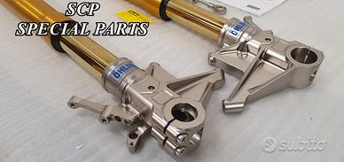 DUCATI PANIGALE 959 DUCATI PANIGALE 899 DUCATI PANIGALE 1199 DUCATI PANIGALE 1299 DUCATI PANIGALE V4 anche modelli S KIT SOSPENSIONI OHLINS PER DUCATI PANIGALE COSTITUITO DA: AMMORTIZZATORE OHLINS TTX GP 2019, FORCELLE OHLINS R&T 43mm con piedini ricavati dal pieno e AMMORTIZZATORE DI STERZO. OHLINS TTGX GP 2019 Öhlins ha previsto per il 2019 un upgrade e revisione della linea ammorizzatori TTX GP. Il nuovo TTX GP presenta un sistema di valvole interne migliorato rispetto alla versione 2018 che ne donano un feeling di comfort e stabilità. La nuova fascia pistone e i nuovi materiali con cui vengono assemblate le parti interne, ne garantiscono una maggior durata nel tempo e una maggior resistenza alle alte temperature di utilizzo. Caratteristiche Principali: Tecnologia TTX Interasse Variabile Precarico Idraulico Integrato Regolazione Compressione Regolazione Estensione Range di regolazione più ampio e preciso, derivante dalla Moto GP T36PR1C1LB TTX GP19 Tecnologia TTX Corpo da 36mm Regolabile in Compressione Regolabile in Estensione Precarico Molla Integrato Serbatoio Azoto Esterno Interasse Variabile FORCELLE OHLINS R&T 43, CON PIEDINI RADIALI RICAVATI DAL PIENO, STAFFE SUPPORTO PARAFANGO RICAVATE DAL PIENO E STAFFA SUPPORTO SENSORE ABS RICAVATA DAL PIENO. TUTTE LE PARTI RICAVATE DAL PIENO POSSONO ESSERE ANODIZZATE DI QUALSIASI COLORE. AMMORTIZZATORE DI STERZO SD 040