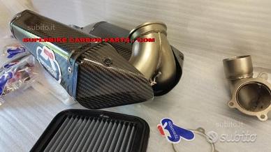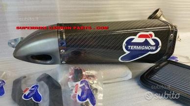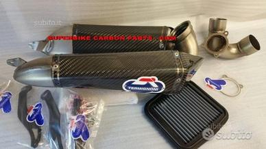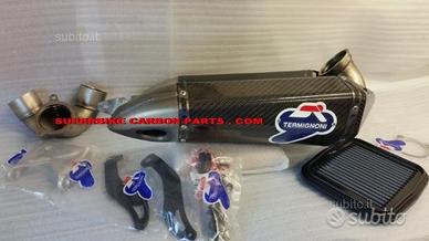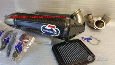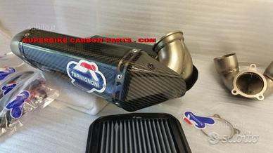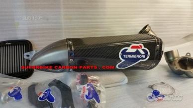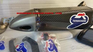 DUCATI PANIGALE 1299 1199 899 959 KIT TERMIGNONI NUOVO MODELLO. Termignoni introduce i nuovi silenziatori per Ducati Panigale, realizzato in carbonio e titanio CUNB, lo stesso utilizzato dal Termignoni Reparto Corse per gli scarichi da competizione. Oltre ai materiali esclusivi, che permettono un peso di soli 1,5 kg per silenziatore, un'altra caratteristica è data dalla uscita frontale del gas, una soluzione che ottimizza le prestazioni e il design. L'uscita frontale dei gas non pregiudica il rendimento del pneumatico posteriore come accadeva con i vecchi terminali. I silenziatori sono forniti con un filtro dell'aria dedicato. I soli terminali con filtro hanno dato al banco un aumento di prestazioni di 6cv alla ruota. DISPONIBILI ANCHE I COLLETTORI COMPLETI IN FULL TITANIO. Disponibile sia per panigale 1299 1199 899 959.
