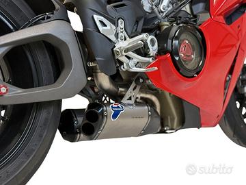 Esso comprende coppia di silenziatori RACING SIMMETRICI SOTTOPANCIA da adattare ai collettori originali.