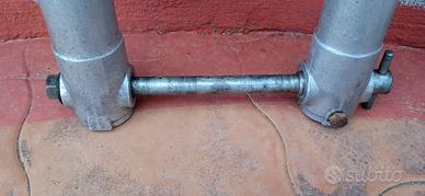 Per "Ducati Scrambler 250, 350, 450": Foto1: forcella ant. completa E. 700; Foto2: triangolo superiore forcella lineato E. 60; Foto3: supporto blocca manubrio originale E. 50; Foto4: asse ruota/forcella anteriore E. 20;