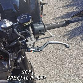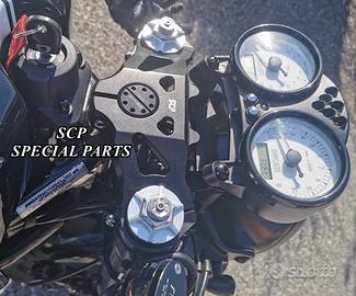 PROTOTIPTAMO E REALIZZIAMO PER QUALSIASI MOTO PIASTRE DI STERZO RICAVATE DAL PIENO CON MACCHINARI A CONTROLLO NUMERICO SPECIFICHE PLUG AND PLAY SI MONTANO SENZA MODIFICHE . PROGETTATE PER FORCELLE STANDARD OPPURE DISPONIBILI SU MISURA PER FORCELLE OHLINS O ALTRA MARCA . PRESENTIAMO PIASTRE PER SPORT CLASSIC DUCATI Il kit piastre è costituito da: piastra di sterzo inferiore con asse canotto e piastra di sterzo superiore specifica. Disponibili sia per semimanubri che con riser per manubrio naked. Possiamo anodizzarle di qualsiasi colore su richiesta. Le piastre sono sovradimensionate con inferiore da 60mm a 3 punti di chiusura oppure disponibile da 80 mm a 4 o 5 punti di chiusura e cave di alleggerimento laterali. Per il montaggio si utilizzano boccole e cuscinetti originali. Possiamo realizzare cave di alleggerimento anche passanti e altre lavorazioni meccaniche su richiesta. Un prodotto rivoluzionario per efficacia e risorse tecniche. Finitura superficiale e anodizzazione di qualsiai colore. Le piastre di sterzo sono progettate appositamente per migliorare il feeling con l'avantreno rendendo la moto piu' stabile in frenata e inserimento curva e direzionale in percorrenza e uscita di curva. La lega speciale utilizzata è testata in pista nei principali campionati internazionali e studiata appositamente per permettere alle sospensioni di lavorare al meglio. Realizzate con Off set standard oppure speciale o regolabile a richiesta. Replichiamo tutti gli attacchi e supporti originali per telaietto, quadro strumenti, blocco accensione, blocca sterzo, ammortizzatore di sterzo etc. oppure ne produciamo su richiesta. Potete scegliere qualsiasi tipologia, forma e lavorazione meccanica o estetica per il progetto delle piastre di sterzo entro i limiti imposti dalla quote della moto stessa, prendendo spunto dai nostri lavori precedentemente effettuati.