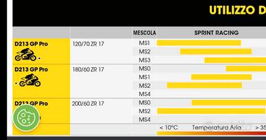 Vendo treno di Dunlop D213 gp pro nelle misure di 120/70 e 180/60. DOT 2023 mescola 1 all’anteriore e mescola 2 al posteriore. Nelle foto trovare anche la tabella delle mescole per capire le temperature ideali di utilizzo.