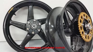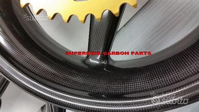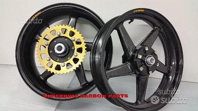 Cerchi Dymag in carbonio specifici per HONDA VTR SP1 E SP2. Disegno a cinque razze che contribuisce a renderli allo stesso tempo solidi e leggerissimi oltre che spettacolari. Il risparmio di peso rispetto ai cerchi originali è abissale, ma anche rispetto ai cerchi in magnesio di altri produttori. Pensate che la coppia di cerchi in carbonio pronta per il montaggio completi di boccole e mozzo porta corona e corona pesa solo 6.7 kg !!!!! Grazie alla particolare tecnica costruttiva e al progetto, il peso è distribuito maggiormente intorno al mozzo ruota. Cosa significa questo? Che grazie al minor peso e maggiormente concentrato vicino all'asse di rotazione si genererà molta meno forza di inerzia. La moto diventerà incredibilmente più agile e svelta nell'eseguire i comandi, ma anche molto più rapida in accelerazione e più efficace in frenata, rendendo al contempo più preciso il lavoro delle sospensioni. Si può ritardare al massimo la staccata e "cucire" traiettorie perfette e strettissime. Con l'ausilio della acquisizione dati sono state rilevate velocità in percorrenza curva dai 7 ai 15 km orari maggiori rispetto a quanto possibile con i cerchi originali! I cerchi Dymag sono certificati BS e TUV anche per uso stradale. Vengono forniti corredati di mozzo e corona. Pronti per il montaggio senza modifiche. DISPONIBILI ANCHE PER QUALSIASI ALTRA MOTO.