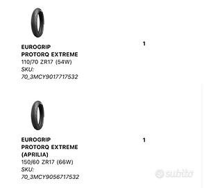 Come da titolo vendo gomme per moto NUOVE mai scartate dall’imballaggio! Vendo per passaggio a cilindrata superiore Le gomme sono di dimensioni: 110/70 R17 150/60 R17 Le gomme sono state sempre tenute al chiuso e nell’imballaggio, mai aperte. Ottime gomme per moto con ottimo grip.