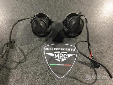 Descrizione: coppia di faretti fendinebbia originali Moto Guzzi per Stelvio 1200 NTX, inclusi cablaggi e staffe di supporto originali.